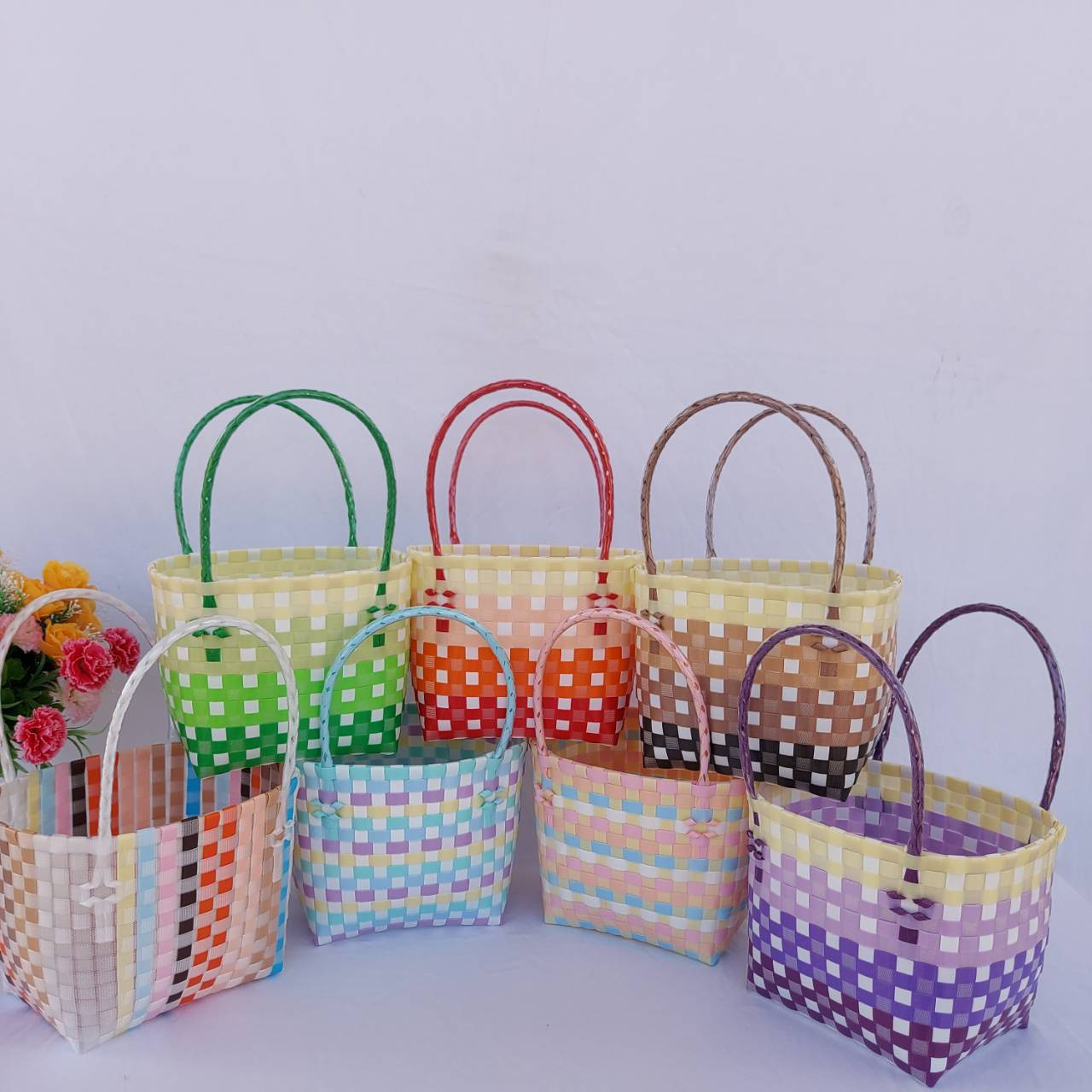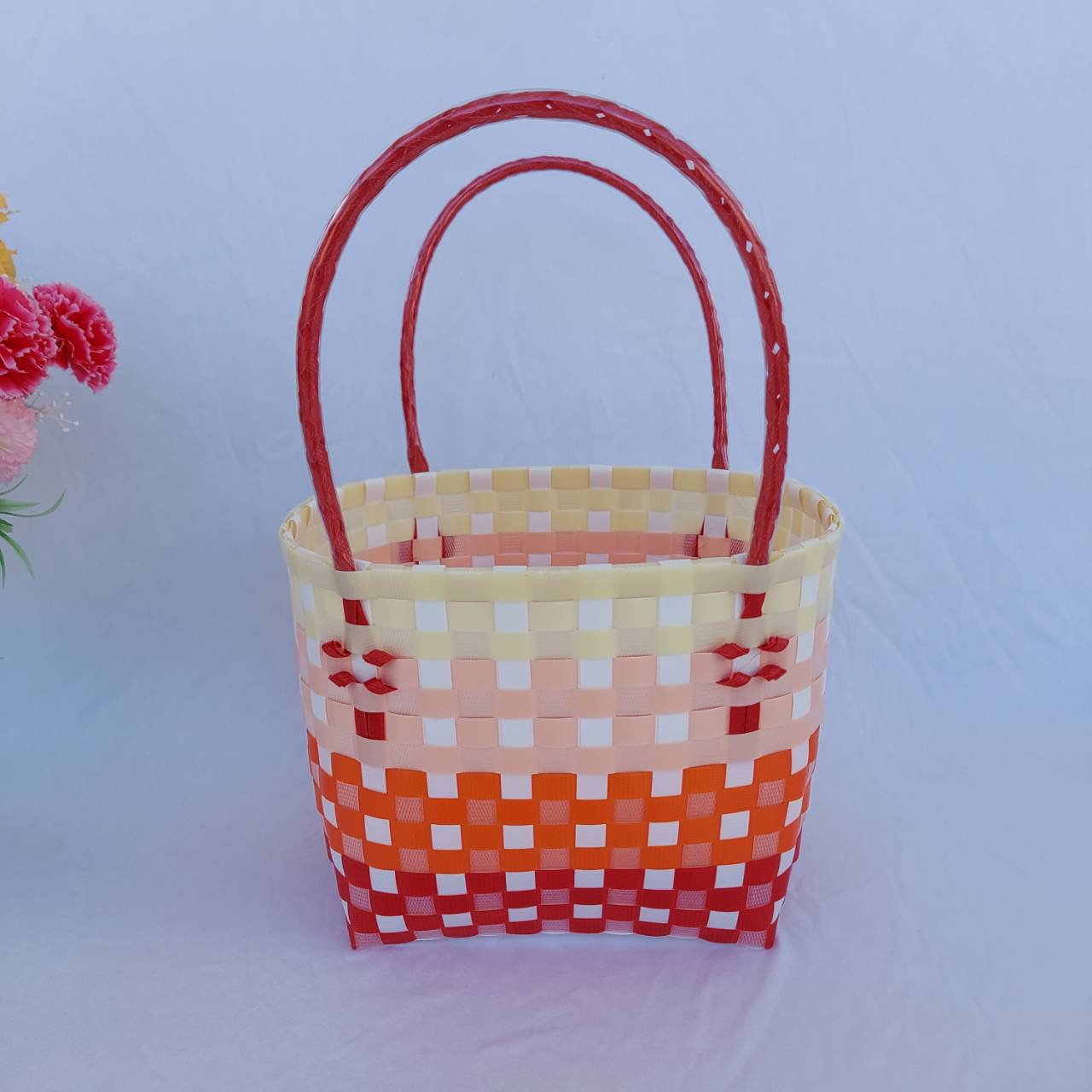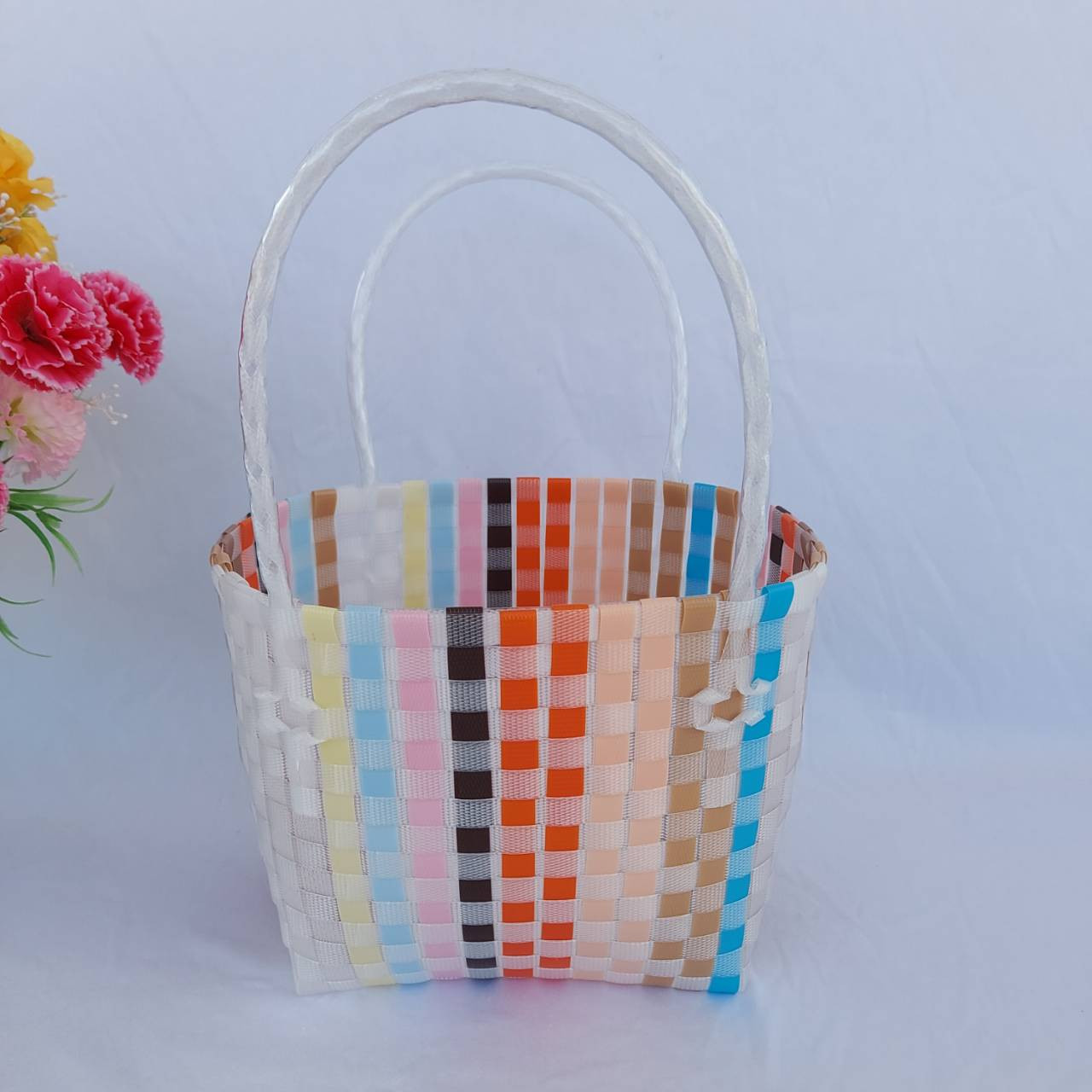 กระเป่าสานเส้นพลาสติก ทรงถือฐานกว้าง ขนาดกว้าง16ยาว20 สูง18 สายสูง 15 CM ขอบปาก กว้าง 14 ยาว 18 ฐานกระเป๋า