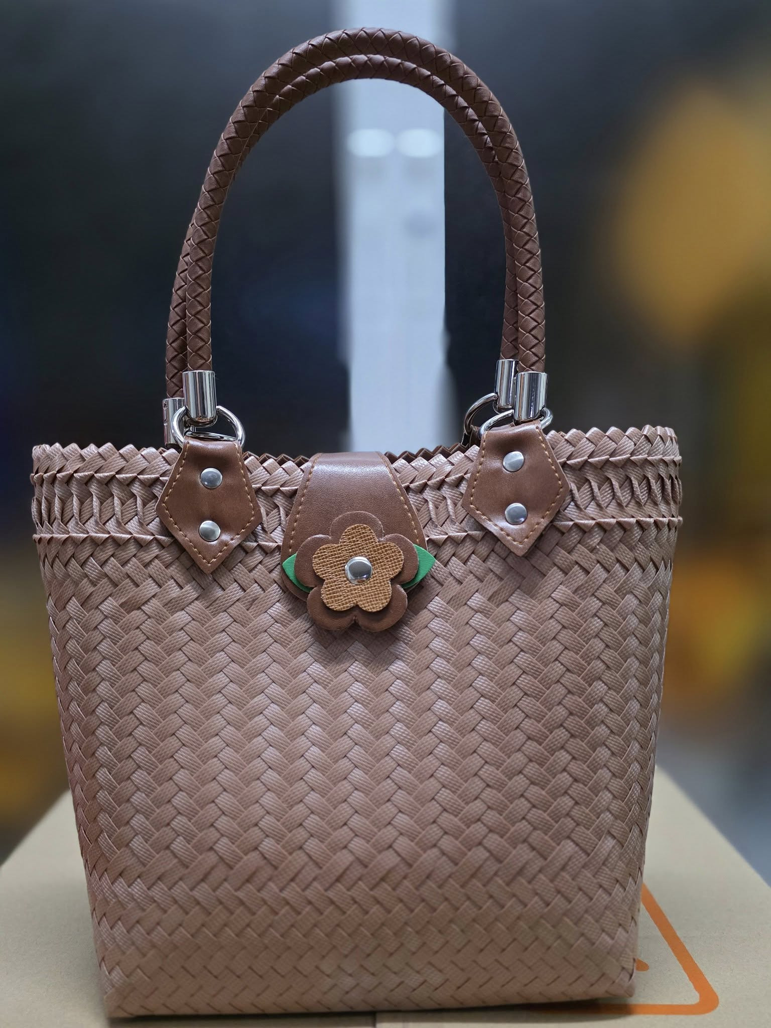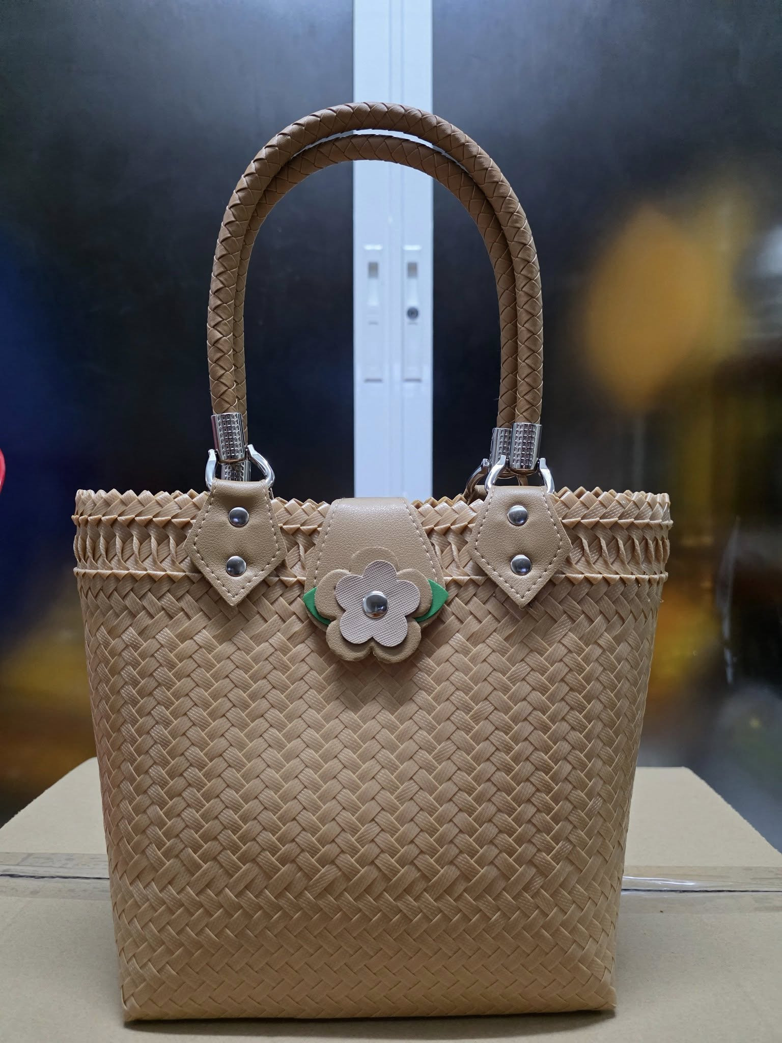 • ดีไซน์: รูปทรงกระเป๋าถือ มีหูหิ้วแบบเปียถักเข้ากับตัวกระเป๋าด้วยห่วงโลหะ และมีตัวล็อกกระเป๋าเป็นรูปดอกไม้สีเบจ/เทา ตัดขอบด้วยสีเขียวเล็กน้อย