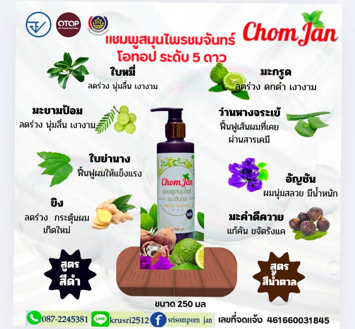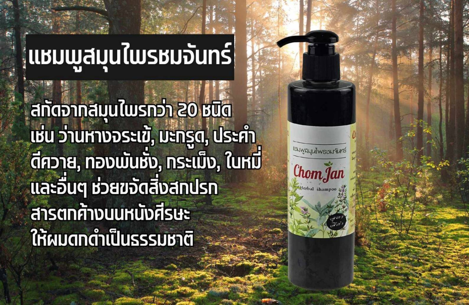 แชมพูสมุนไพรชมจันทร์ สกัดจากสมุนไพรกว่า 20 ชนิด เช่น ว่านหางจระเข้ มะกรูด ประคำดีควาย ทองพันชั่ง กระเม็ง ใบหมี่ และอื่นๆ ช่วยขจัดสิ่งสกปรก สารตกค้างบนหนังศรีษะ ให้ผมดกดำเป็นธรรมชาติ