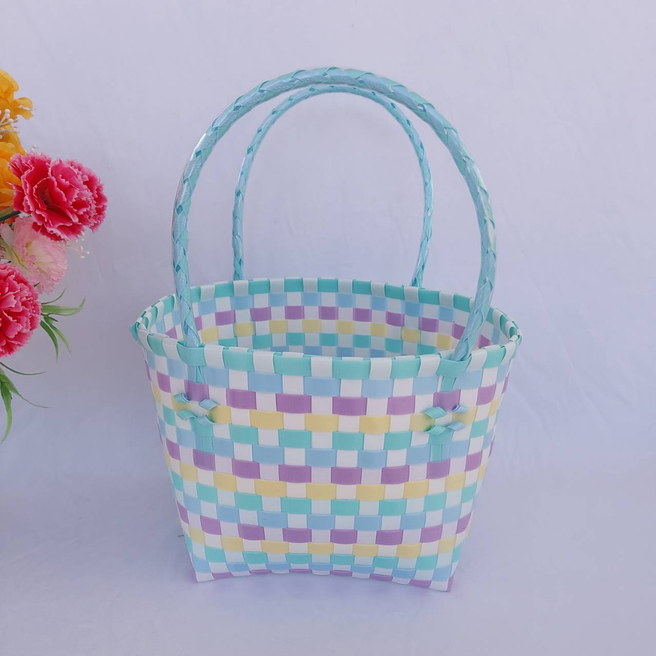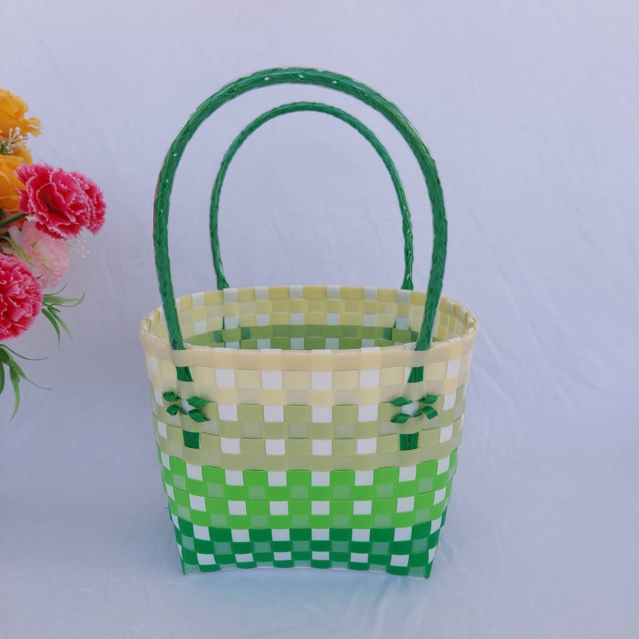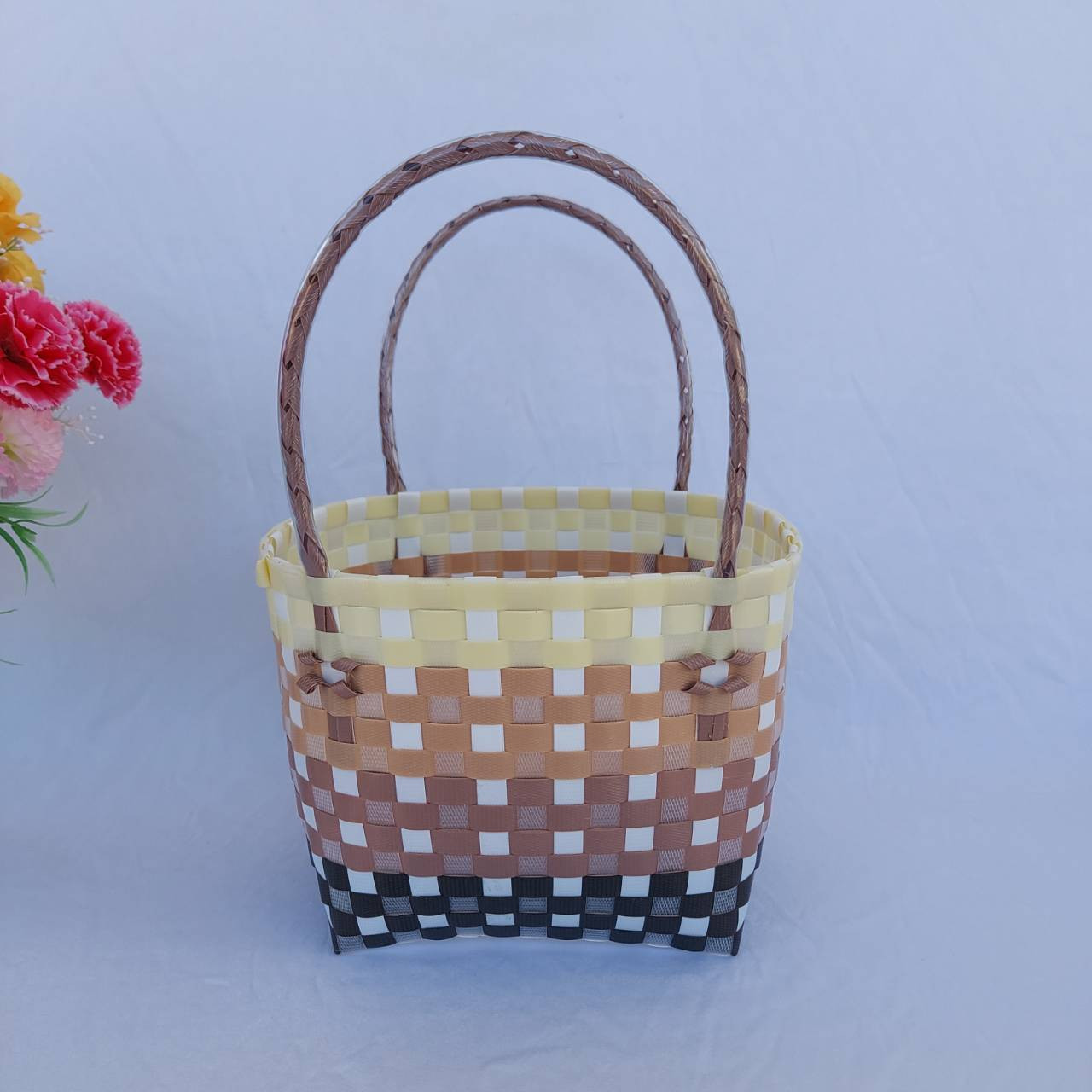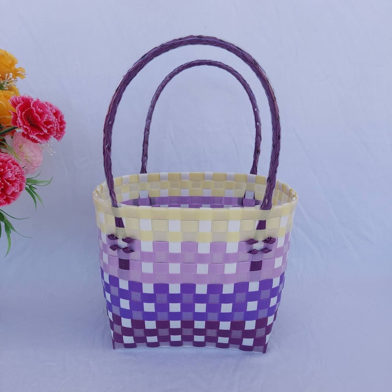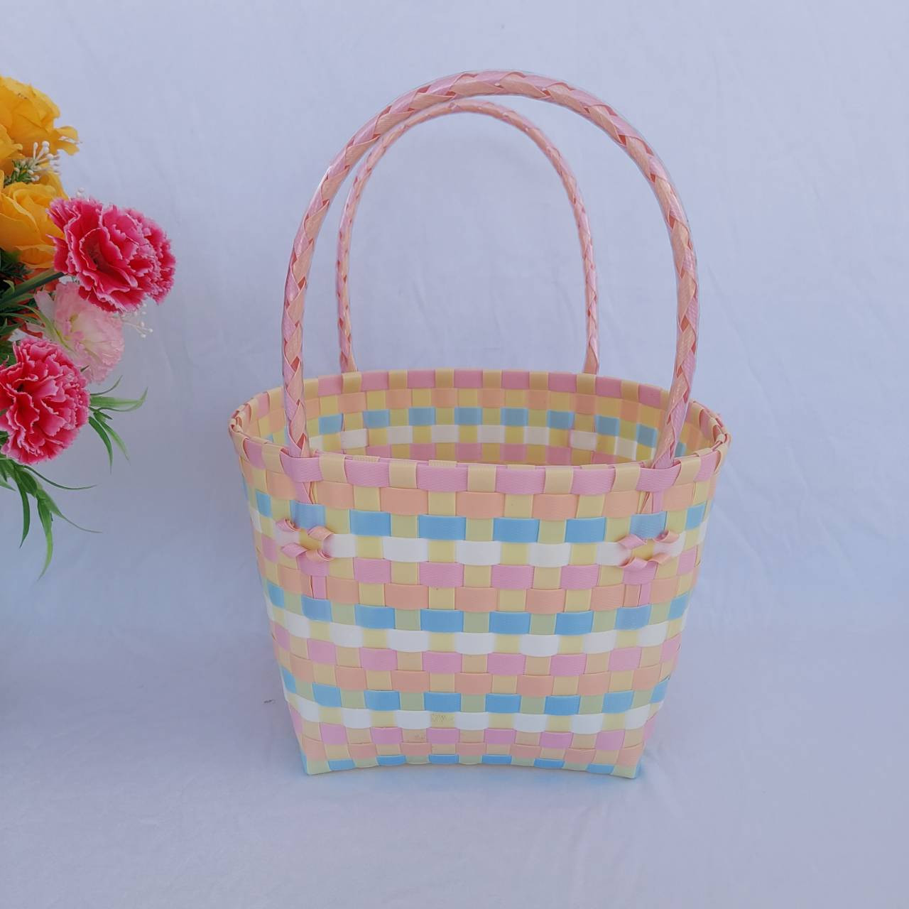กระเป่าสานเส้นพลาสติก ทรงถือฐานกว้าง ขนาดกว้าง16ยาว20 สูง18 สายสูง 15 CM ขอบปาก กว้าง 14 ยาว 18 ฐานกระเป๋า